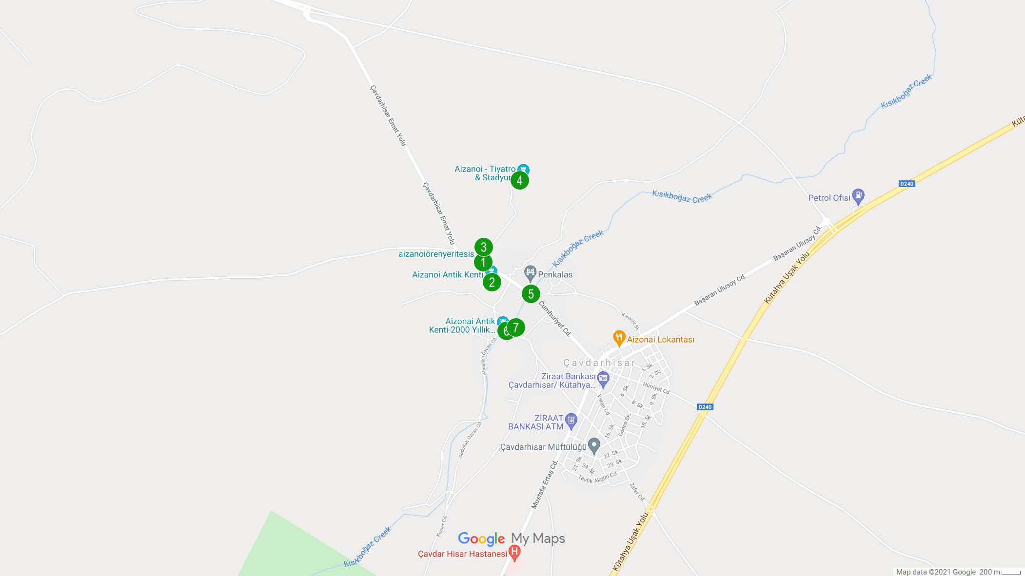 Bu bölümde Aizanoi Antik Kenti’nde gezilecek yerlerin konumlarını paylaşıyoruz. Google Maps® konum listesini kendi hesabınıza buradan ekleyebilir, özelleştirdiğimiz harita detaylarına buradan ulaşabilirsiniz. Biz kendi gezdiğimiz sıraya göre bir rota oluşturduk. Bu rotayı kullanarak zamanınızı verimli bir şekilde değerlendirebilirsiniz.